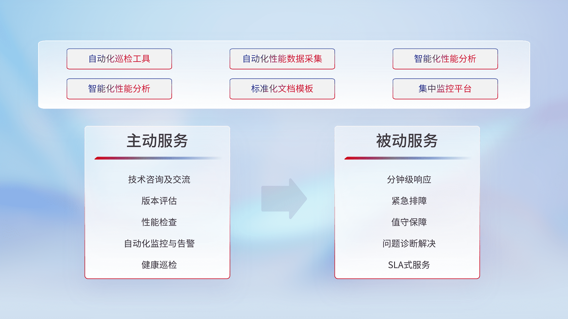 智能化工具和标准化文档,,保障服务质量,,,提供主动服务(包含技术咨询、、版本评估、、、性能检查、、、、自动化监控与告警、、、健康巡检)和被动服务包含(分钟级响应、、紧急排障、、、值守保障、、、、问题诊断解决、、SLA服务)。。。。